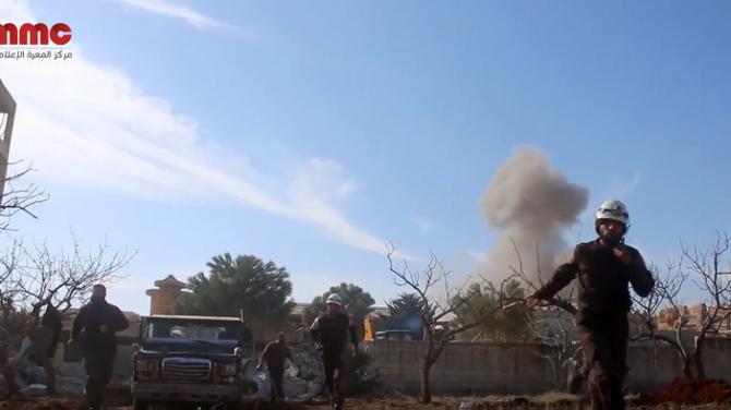 This image taken from video provided by the Syrian activist-based media group Maara Media Center, which has-been verified and is consistent with other AP reporting, shows Syrian Civil Defense rescuers running from the site of a second explosion near a hospital run by an international medical charity, also known by its French acronym MSF in Maaret al-Numan, Idlib, Syria, Monday, Feb. 15, 2016. Doctors Without Borders says an attack on a clinic in northern Syria supported by the group has killed several people and that more are are presumed dead. (Maara Media Center,via AP Video) MANDATORY CREDIT